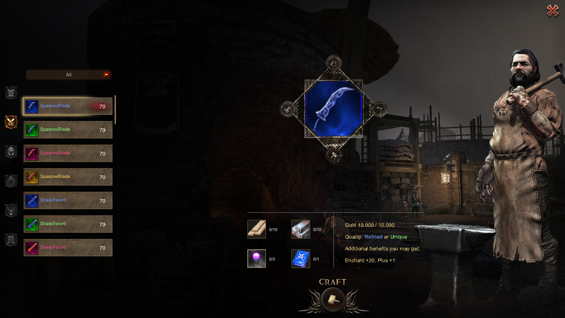The Craft System allows players to upgrade equipment quality using specific materials and silver. Requirements vary depending on the equipment type and quality tier.